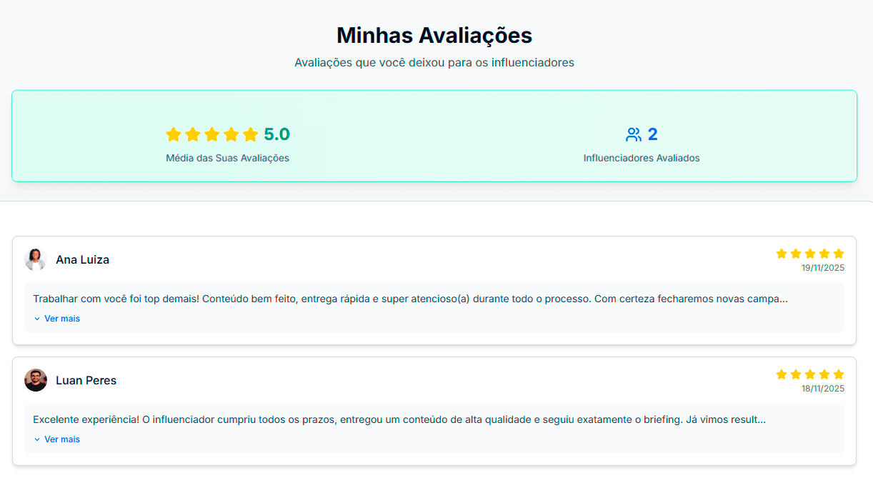 Consulte avaliações de outros anunciantes antes de contratar e avalie cada influenciador após a parceria. Transparência e confiança para todos.