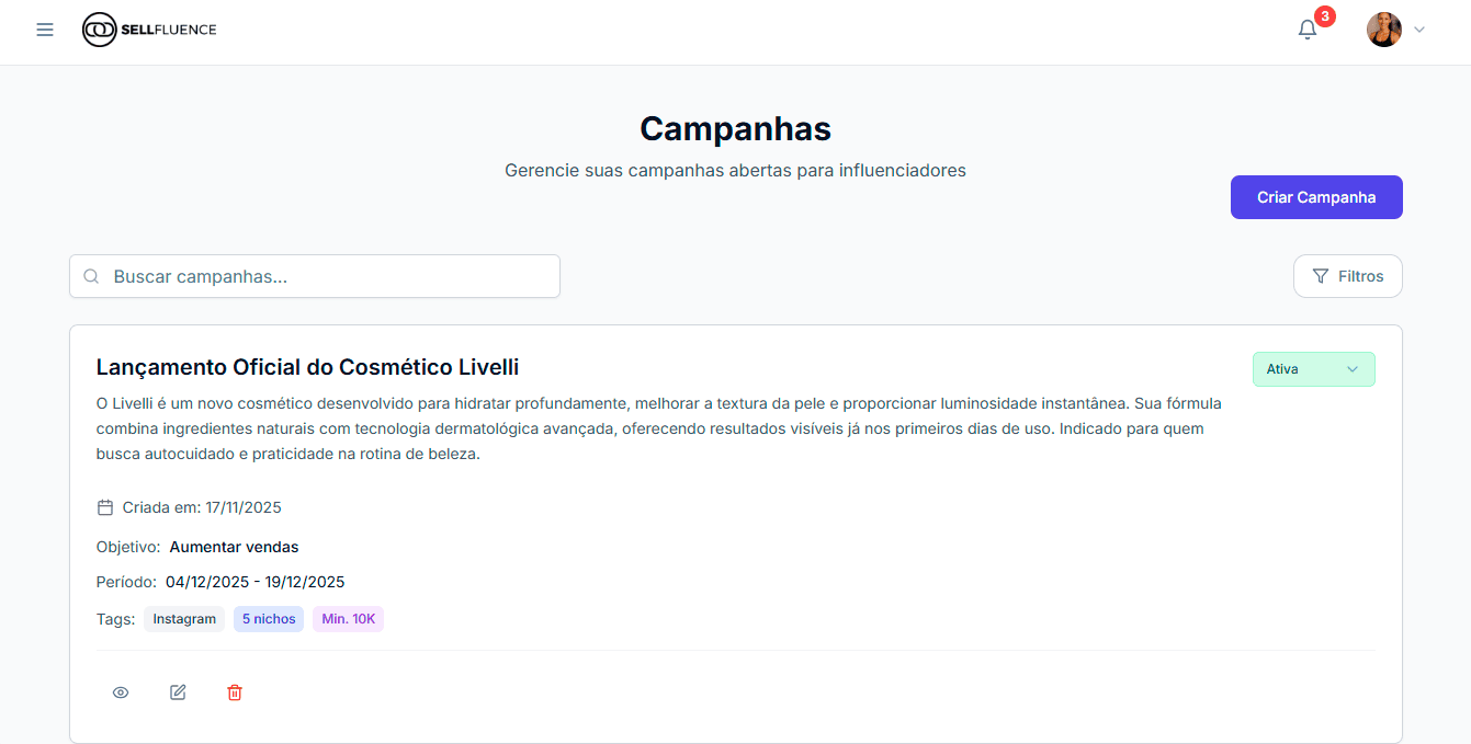 Crie campanhas abertas e receba candidaturas de influenciadores interessados, ou envie propostas personalizadas diretamente para perfis específicos.