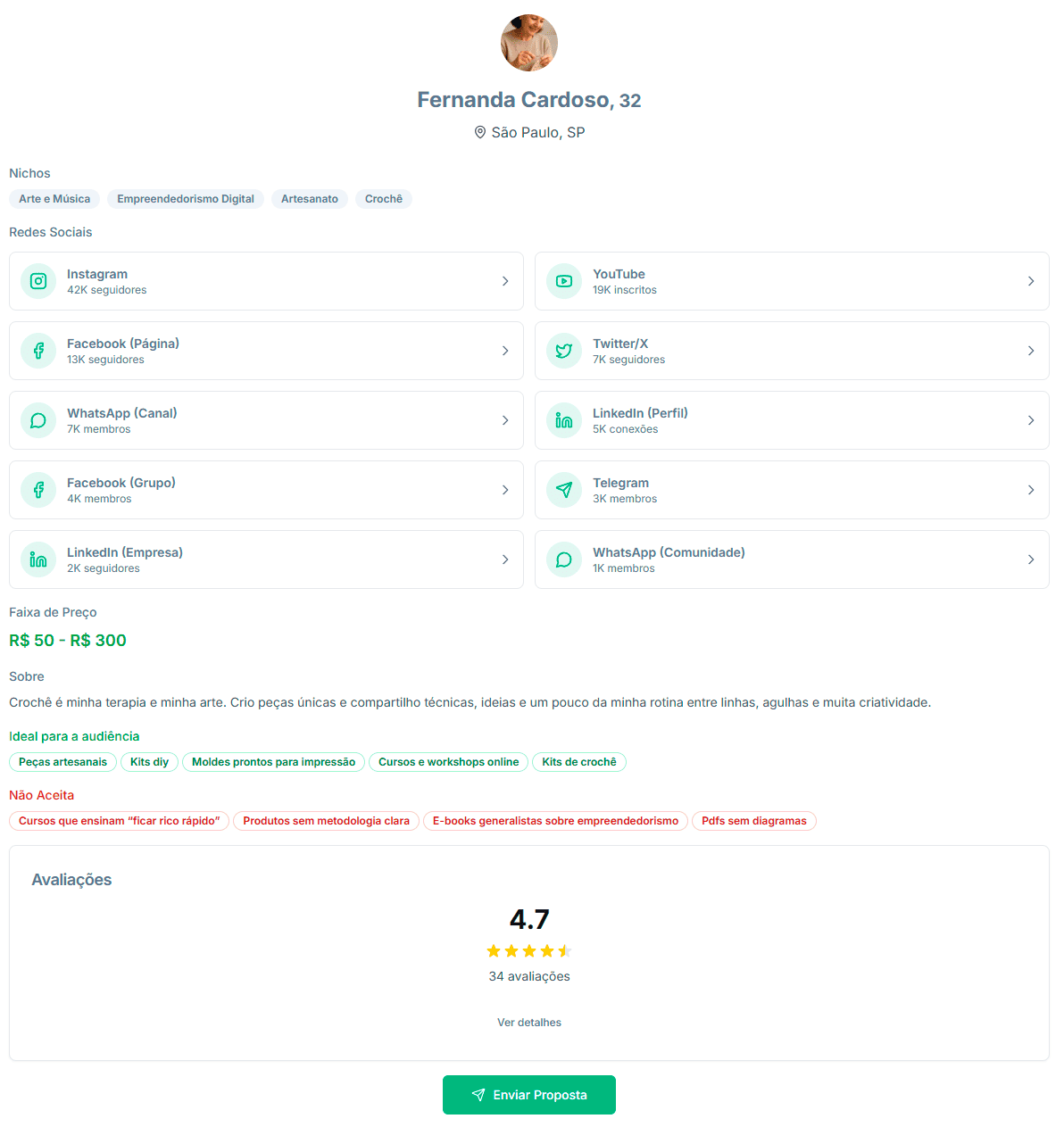 Acesse informações completas sobre o influenciador: links diretos para redes sociais, histórico de campanhas, avaliações de outros anunciantes e preferências de parceria.