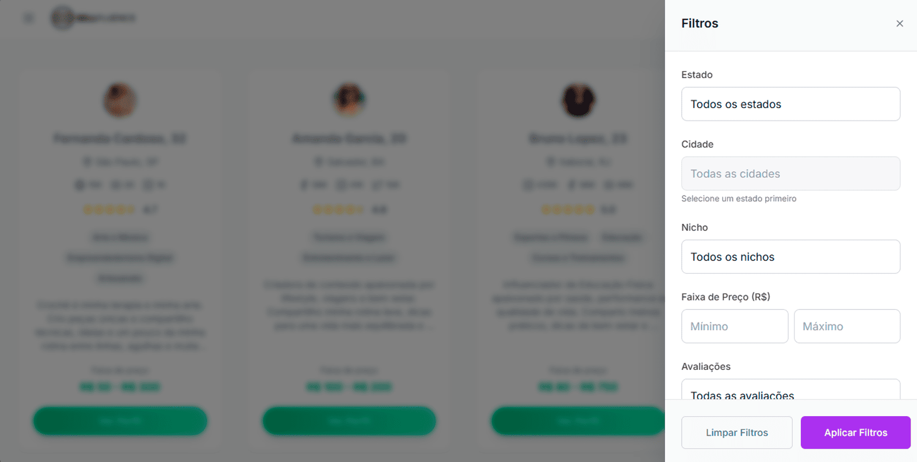 Filtre por localização, nicho, redes sociais, número de seguidores, faixa de preço e muito mais.