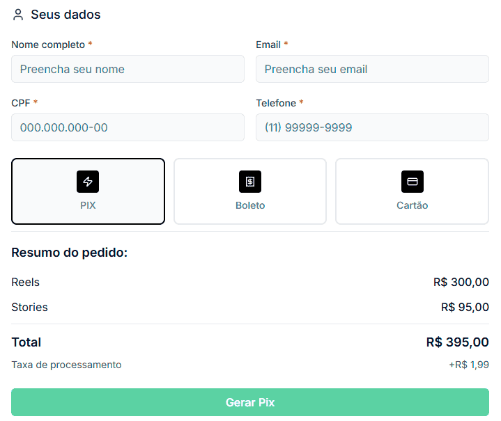 Live, Reels, Stories, Post no Feed e muito mais. Escolha os formatos que melhor se encaixam na sua estratégia e defina as quantidades.