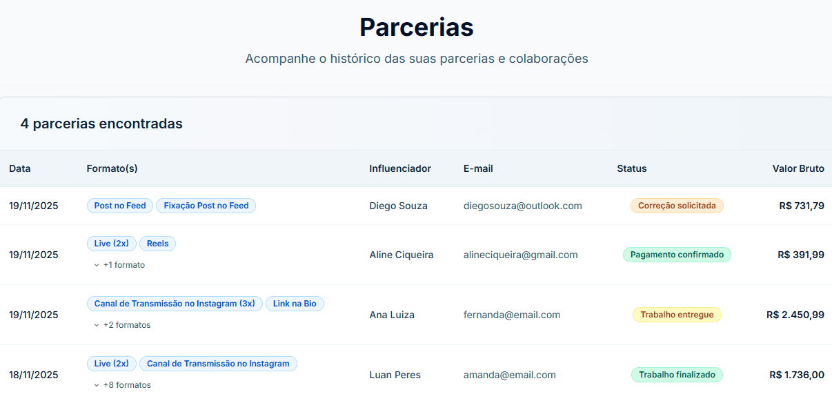 Gerencie todas as suas parcerias em um único lugar. Acompanhe o progresso, status e comunique-se diretamente com os influenciadores.